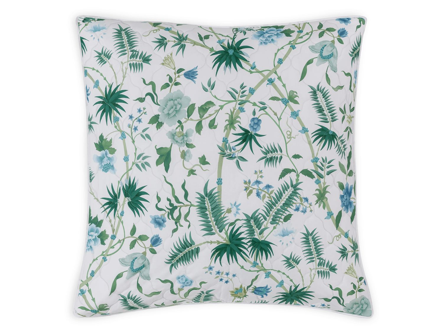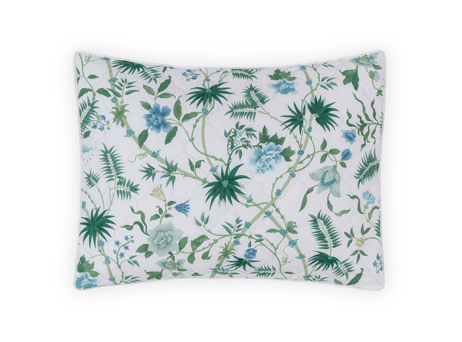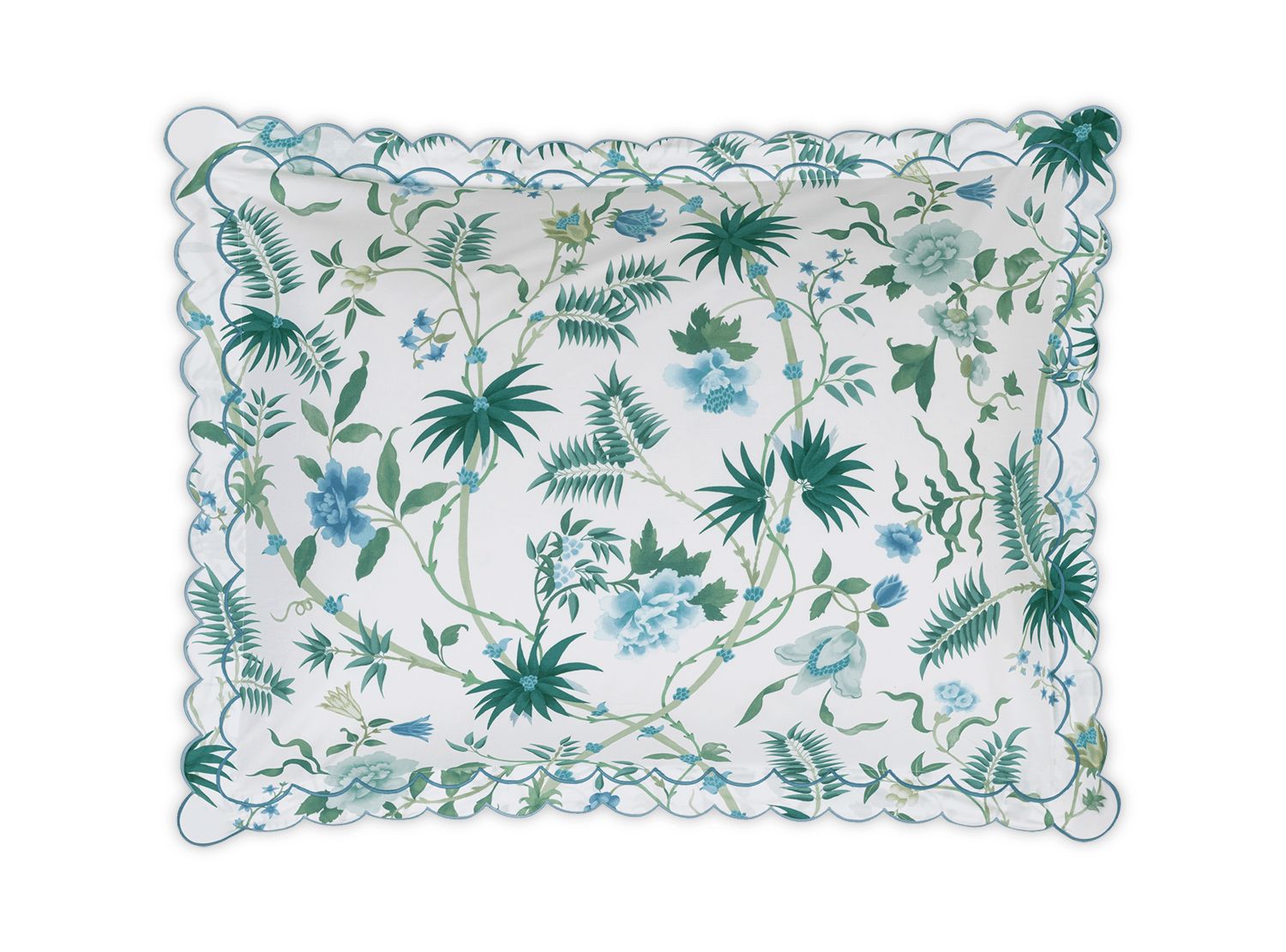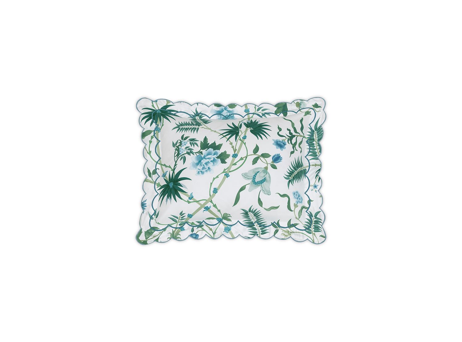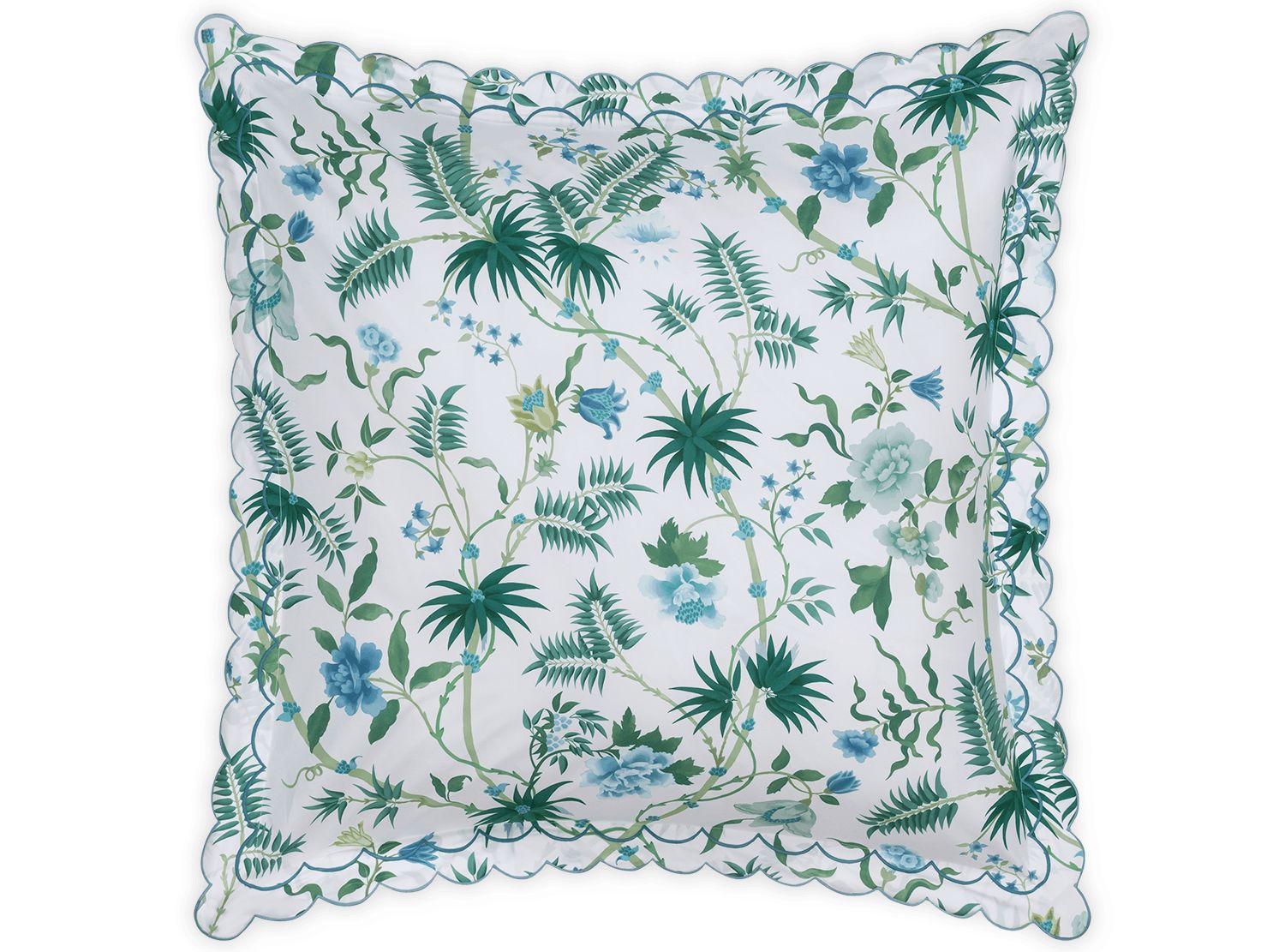Based on a vibrant Schumacher wallpaper, this tropical print is rendered in a lush emerald and blue-green palette with oversized palm fronds and blooms. Printed on Luca Egyptian cotton percale and finished with a double scallop embroidery, Palmyra offers an island-inspired escape that feels both tranquil and transportive.